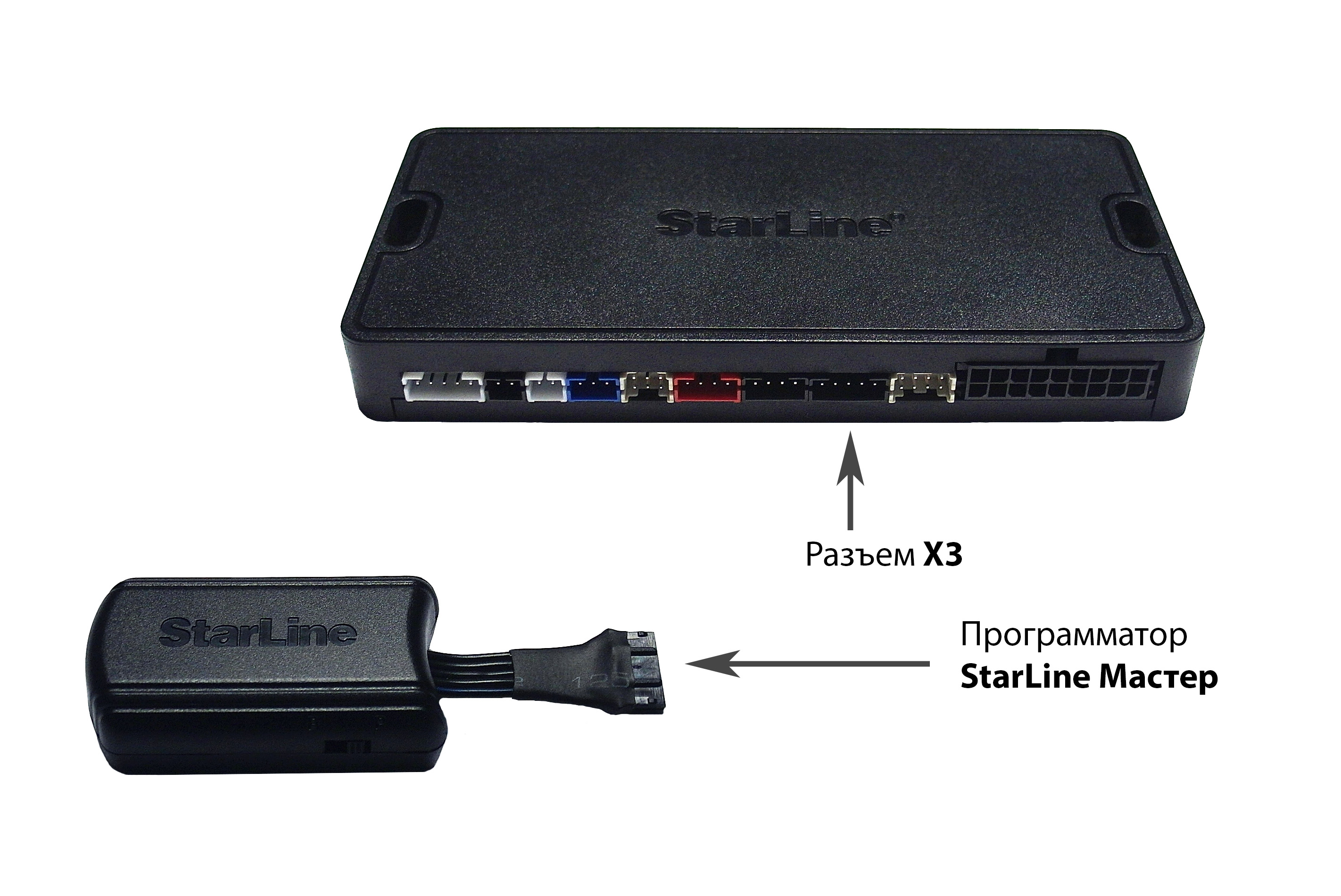 Для StarLine А93/63, АХ3, В95, D95, E95, Е91.1/61.1, Е90.1/60.1 подключите программатор к разъему «Х8» центрального блока сигнализации.ВНИМАНИЕ! При проведении процедуры программирования к центральному блоку не должны быть подключены никакие дополнительные модули.